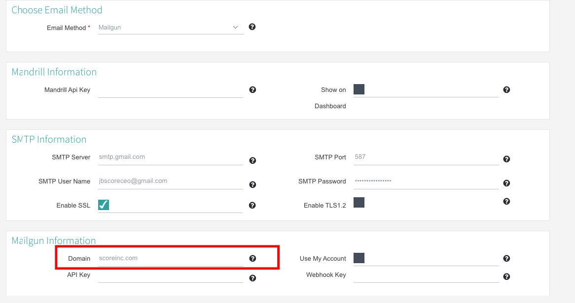 Locate the Mailgun Information area and you can choose between to avialable domains ScoreCEO has to offer.