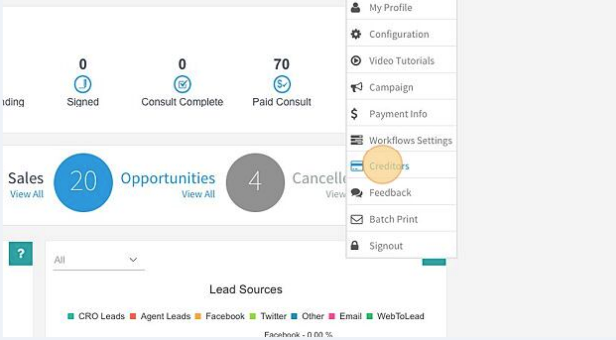 Step 3: Select Creditors: From the options available in the configuration drop-down menu, choose "Creditors." This selection will direct you to the creditor management section.