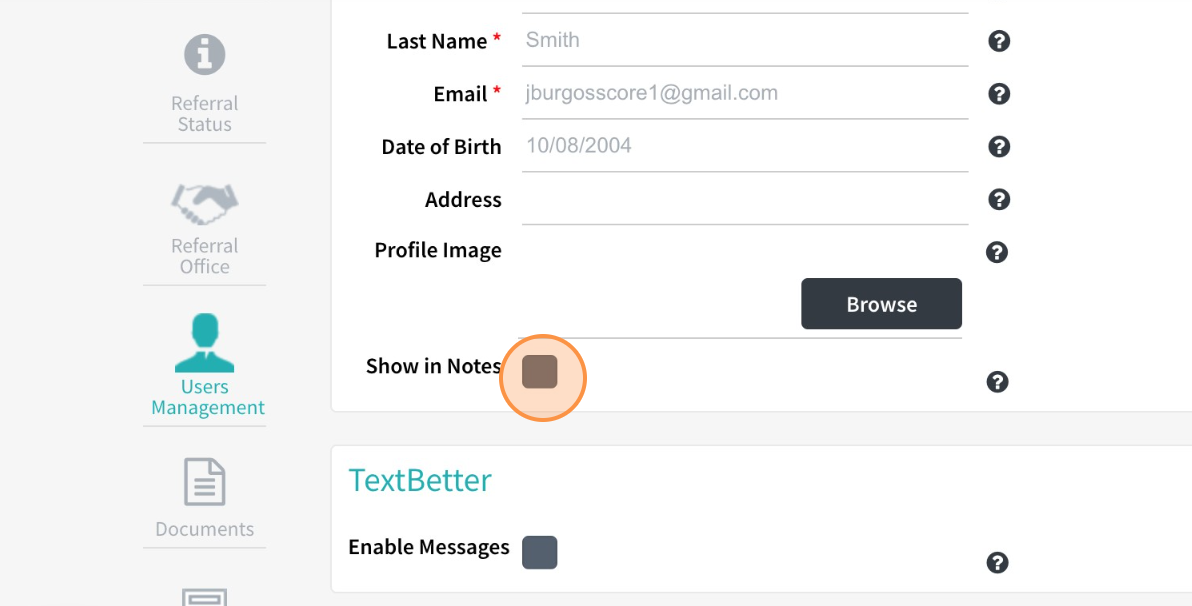 In the user's profile edit mode, look for the checkbox labeled "Show in Notes". This checkbox, when marked, enables the user to appear in the Notes area and receive notes via email.